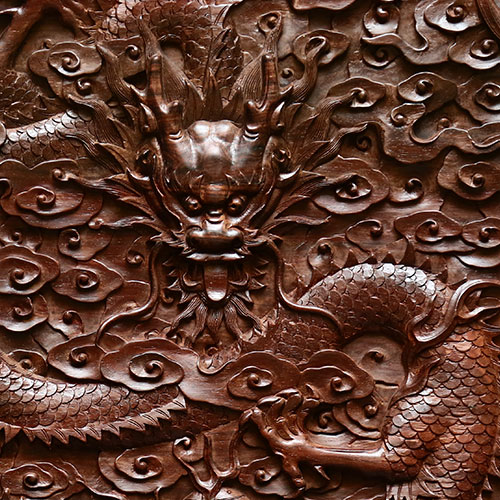 此寶座選用珍貴的大紅酸枝作為原材料,搭腦呈平頭狀,靠背中間高,向兩邊扶手遞減呈梯形。結構設計巧妙,對稱布局,每個面板皆雕著一條騰飛的金龍,刀法精密,圓潤渾厚;龍紋栩栩如生,云紋舒卷生動,龍的姿態各異,有的昂首前瞻,有的回首瞭望,動感十足。座面嵌裝硬板,束腰內收,雕有纏連枝紋,四條三彎腿做同樣的獸首,足下踩有豐碩的地平,端莊穩重。